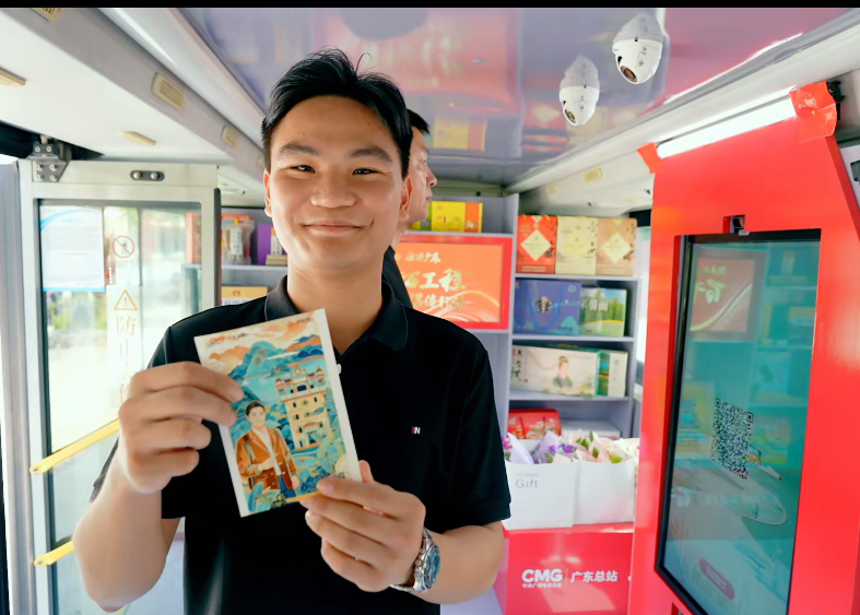 行进中,总台大巴化身为广东农特产品展示平台,搭建“百千万工程”特色农产品展销平台。此外,结合AI技术设计互动玩法,化身为移动的“时光照相馆”。通过AI技术选择奋斗场景,拍摄个人定制“时光照片”,展现建设广东“百千万工程”的奋进姿态。